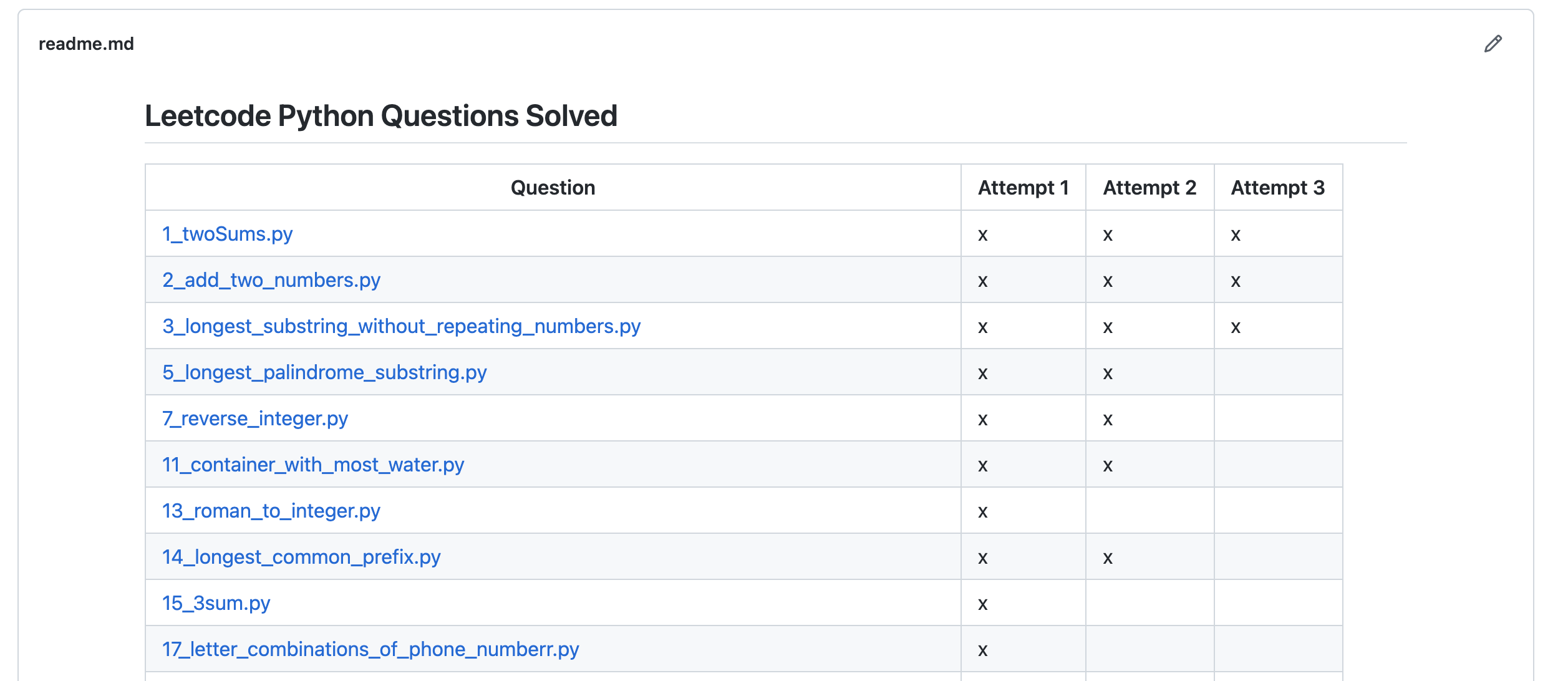 Repository에 문제들을 올리며 자연스레 리드미도 어떻게 관리할 지 고민을 하기 시작했었는데.. 아카이빙에 집착하는 나로써는 어떤 방식을 택해도 만족스럽지가 않았다. 특히나 문제를 하나하나 풀 때마다 리드미를 수동으로 업뎃해야 한다는게 너무너무 귀찮았고 문제 기록이 밀리기 시작한 나머지 리드미를 아예 삭제해버렸다 (급발진). 최근에는 미국 코테를 준비하며 Leetcode에서 푼 문제를 다시 풀어봐야되는 일들이 많이 생겼기에 리드미를 다시 부활시켜야할 필요성을 느꼈고 실행 한 번에 내가 Repository에 추가한 풀이를 리드미에 작성해주는 파이썬 스크립트를 작성해보았다. 프로젝트라고 하기엔 거창한게 없지만 내 삶의 질을 수직상승 시켜준 프로그램이기에 블로그에 작성해두려한다.