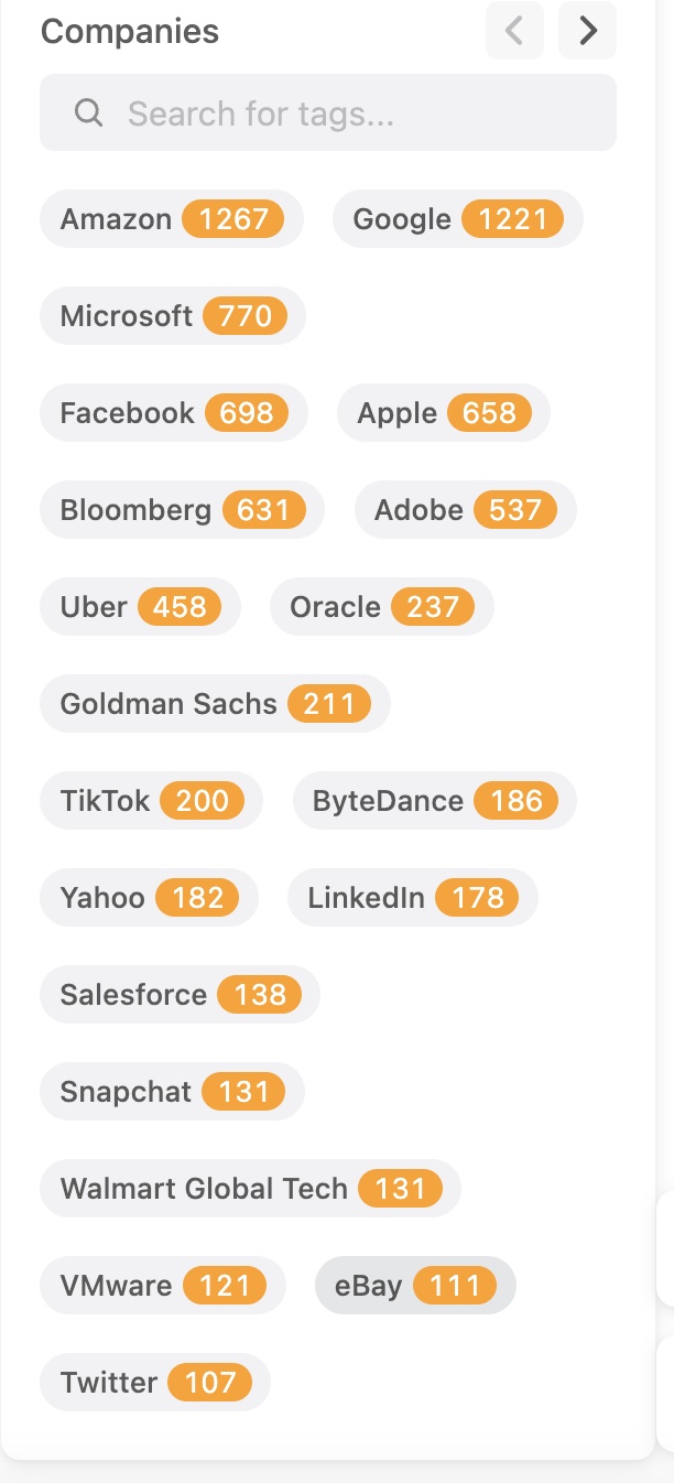 이런 태그된 문제들도 상위 20개 정도는 풀어보는 것이 좋다. 기업마다 내는 문제들의 특성이 다르기 때문에 이 리스트를 리뷰하고 가는 것도 매우 중요하다. 하루에 Blind 75 문제 4개 + 기업 태그 문제 4개 이렇게 풀어보는 것을 추천한다.