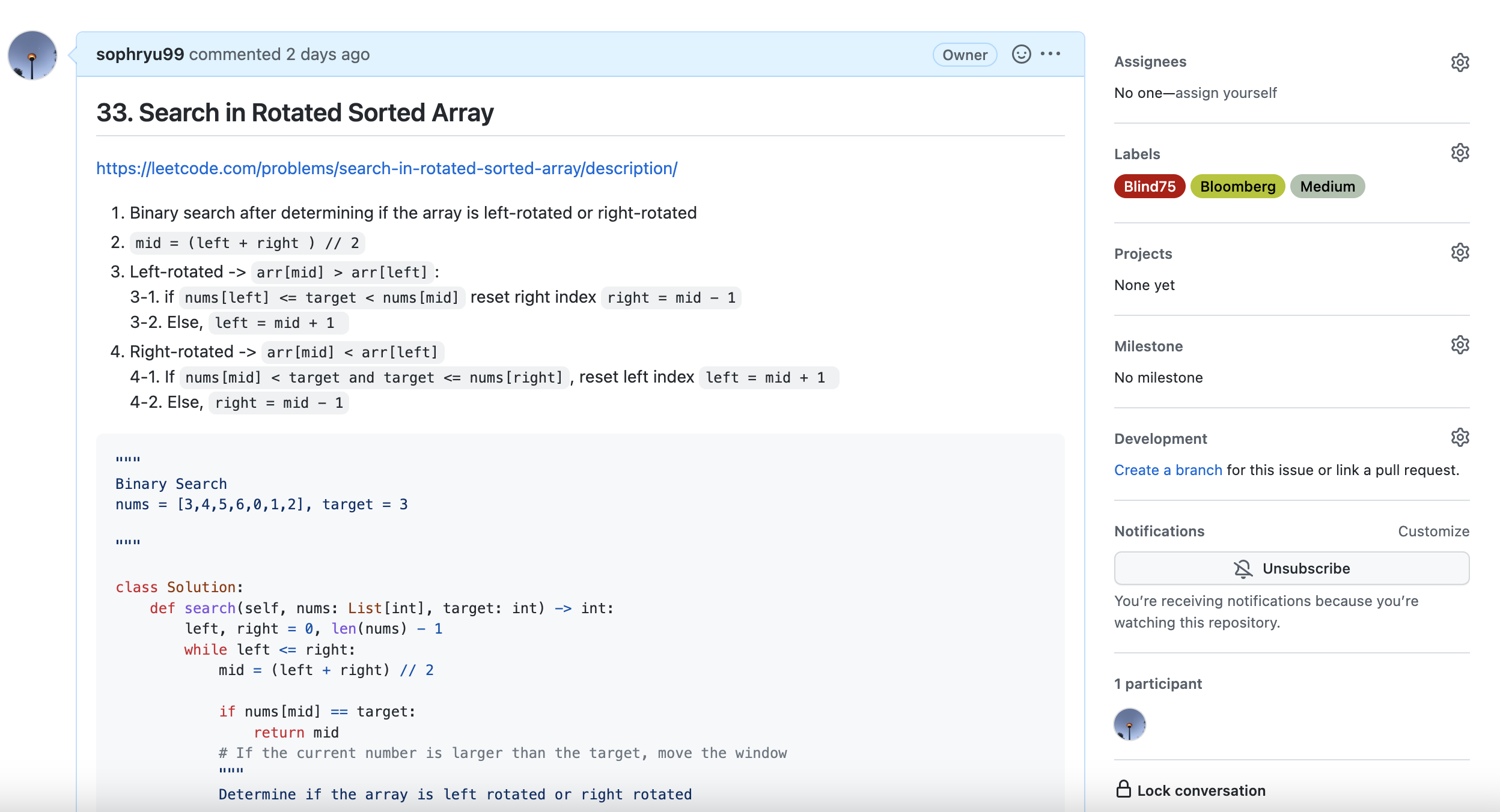 여기서 한 단계 더 나아가고 싶다면, 문제 별로 나만의 풀이를 마크다운으로 정리한다. 나중에 다시 봤을 때, 아 이 문제 이렇게 풀었었지?가 바로 떠오를 수 있을 정도로 간단하고 직관적으로 정리한다.