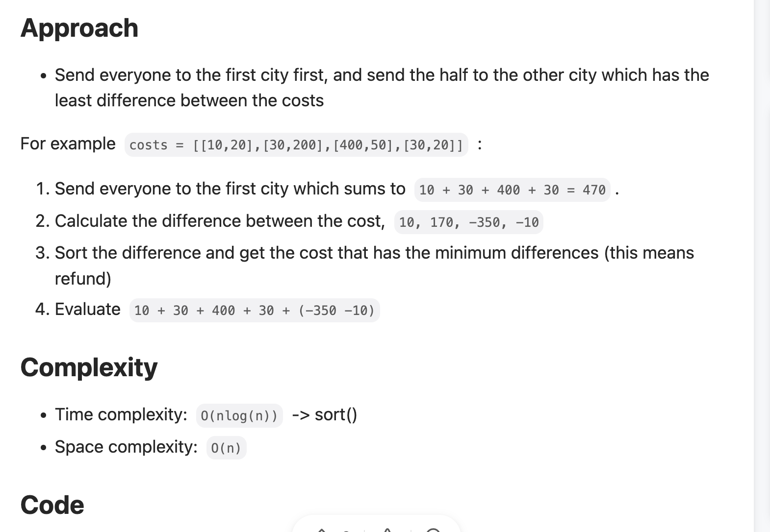 그 후, 바로 구현에 들어가지 않고 Solution 탭에 들어간다. 리트코드 프리미엄을 사용한다면 오피셜 솔루션도 볼 수 있지만, Upvote순으로 정렬 해놓은 사람들의 풀이로도 충분하다. 솔루션을 확인하는것이 필수적인 이유는, 문제가 요구하는 방식의 풀이를 놓칠 수도 있고, 항상 나보다 효율적인 approach로 문제를 푸는 사람들이 있기 때문이다. 지금 당장에 내가 이 문제를 풀 수 있어도, approach가 틀렸다면 말짱 꽝이다. 인터뷰어는 내가 이 문제를 풀 수 있는지 궁금해 하는 것이 아니라, 어떤 방식으로 접근하는지를 더 중점적으로 본다.
